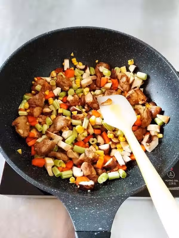 (5)將大米淘洗乾淨,裝入電飯鍋,加淹過大米一個手指節深度的水。將炒好的排骨和配菜一起倒入大米中,用筷子撥平。按下「煮飯」鍵,大約煮45分鐘即可煮好。煮好米飯不急於揭蓋,小燜10分鐘,口感和味道會更好。