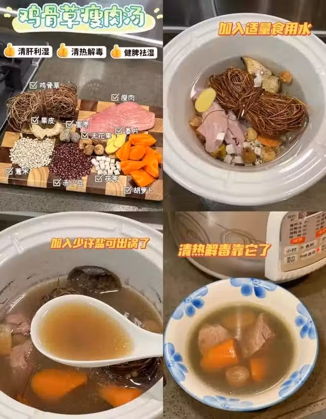 雞骨草、瘦肉、赤小豆、薏米、茯苓、蜜棗 、無花果、薑片、陳皮、胡蘿蔔