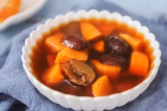 3、鍋中熬足40分鐘,撈掉生薑不要,加入紅薯和紅糖,蓋上蓋子再熬20分鐘即可。