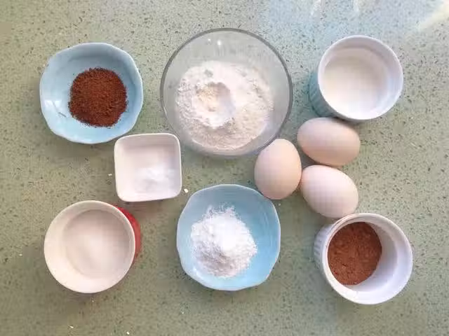 1、將所有的材料都一一稱重備用,將低筋麵粉、玉米澱粉、泡打粉等粉類混合均勻,然後過篩後備用,將可可粉加少許的清水溶化備用。接下來開始製作蛋黃糊部分,將雞蛋蛋清與蛋黃分離到無油無水乾淨的容器中,蛋黃中加入細砂糖,用蛋抽攪拌均勻,接著倒入牛奶攪拌均勻。