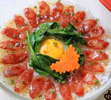 在米飯上面擺入切片的臘腸,蓋上蓋子繼續回微波爐高火2分鐘;