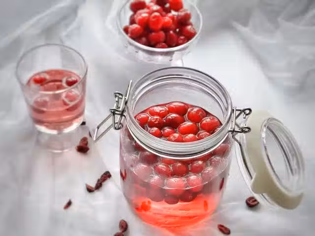 1.將新鮮的蔓越莓放到罐子的底部,加入冰糖,冰糖最好用這種大塊的。倒入蔓越莓汁,加入白酒封瓶。然後等待至少1個星期,就可以喝啦!