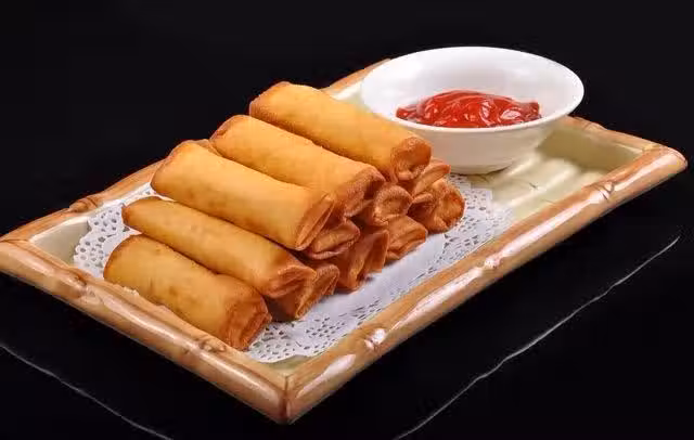 3.把熟菜放在春卷皮一端中間。捲起,兩邊往中間折。捲起用蛋液沾一點粘上。