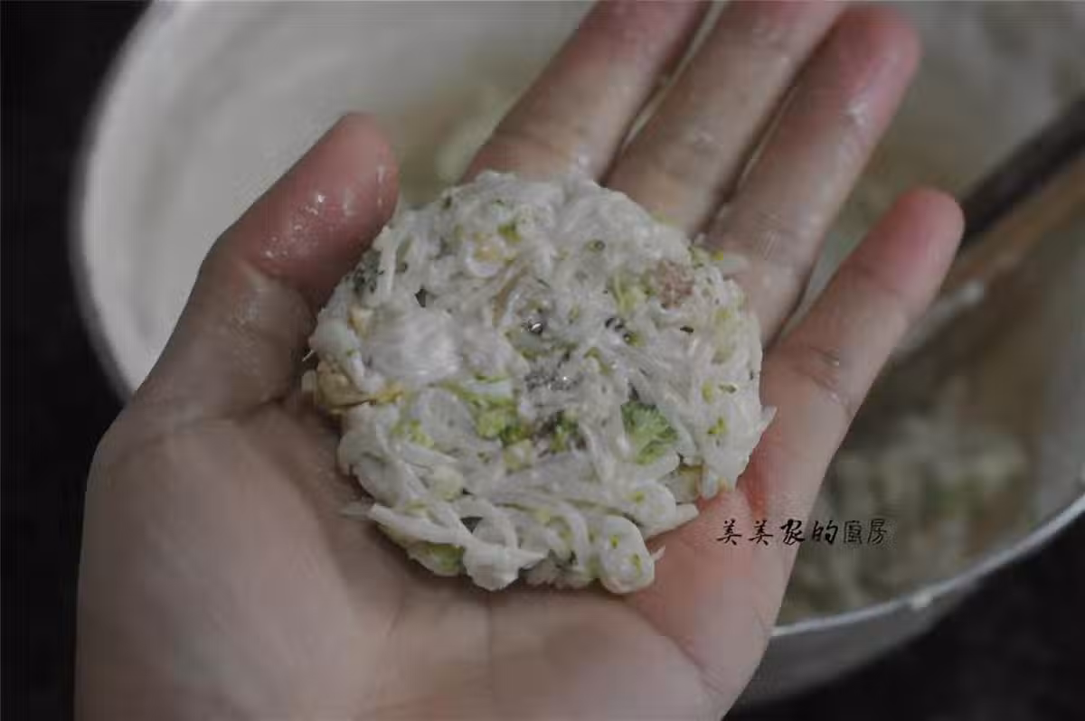 用力將蘿卜絲捏成團,蘿卜絲成團後,放在手心稍微壓扁。