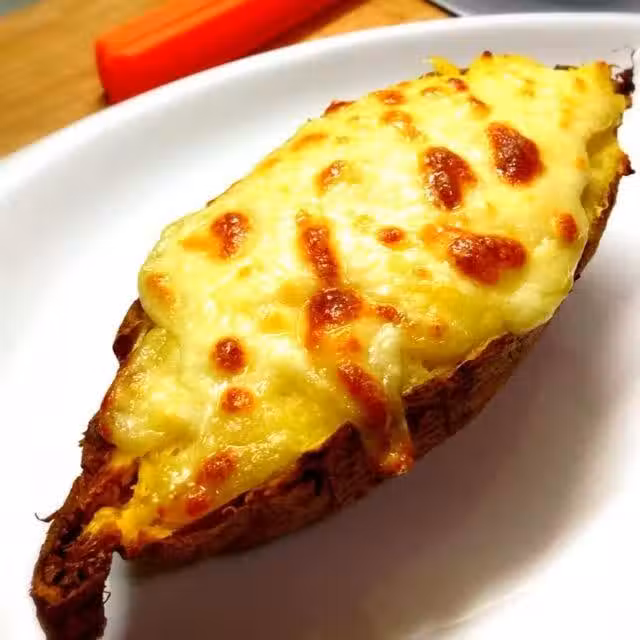 4.盛入紅薯殼中抹平,均勻地鋪上奶酪;