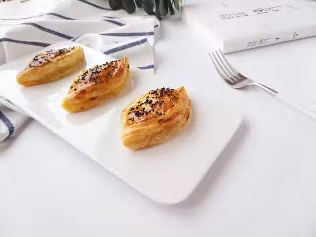 2.蛋撻皮去除外面的錫紙托,解凍後倒入炒好的餡料,然後對摺蛋撻皮,收口,放入墊好錫紙的烤盤