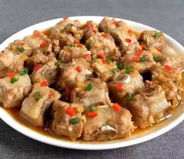 4:進行調味:剛才加入澱粉的排骨加入鹽、生抽、白砂糖、料酒、蚝油用乾淨的手抓均勻,再加入豆豉和蒜頭碎碎攪拌均勻,最後加入適量的花生油拌勻即可。(調味料的量因個人口味和排骨的數量放)