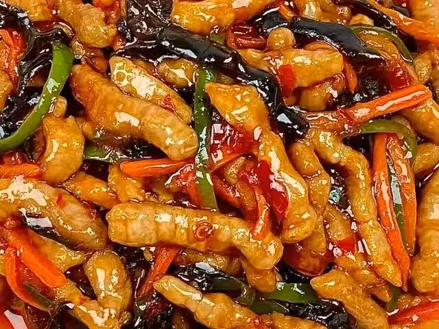 準備食材:瘦肉,胡蘿蔔,黑木耳,青椒,薑絲,蒜片,蔥段,魚香醬汁。