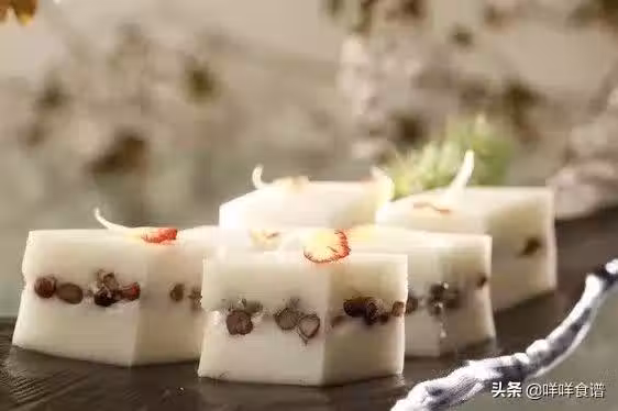 荸薺粉、澱粉、澄粉、椰漿(260克)、香草精拌勻成糊狀備用;將椰漿140克、清水460克、細砂糖入鍋中煮沸騰加入紅豆粒再次煮開離火煮至糊糊狀,然後加入拌勻的荸薺粉、澄粉等攪拌均勻成膏狀,用蒸屜大火30分鐘蒸熟;蒸好後放涼入冰箱冷藏,切條即可食用。