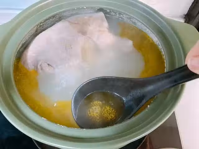 7、接著將砂鍋中的豬肚和雞撈出來,稍微晾涼之後切成片,豬肚切成片,雞肉也切成塊,接著將豬肚和雞肉放在一個小砂鍋中,如果是白鬍椒碾碎燉湯的,湯加入小砂鍋中的時候要過濾一下。