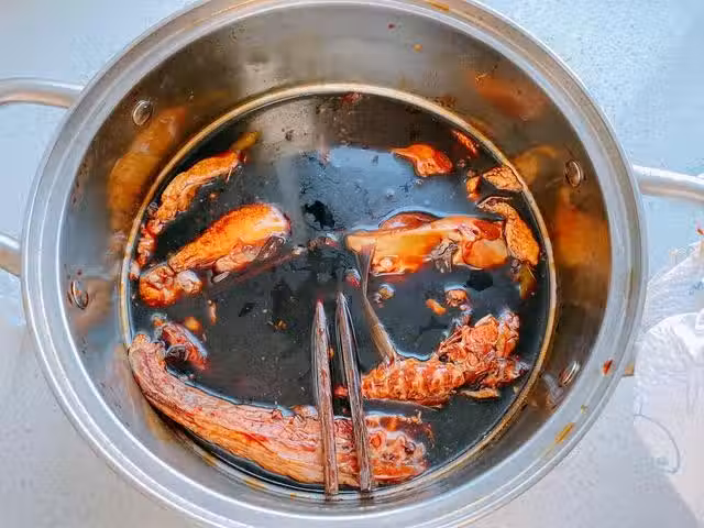 7、時間到,將鴨肉取出來,瀝干醬油,瀝干之後,用繩子綁緊鴨腿,放在外面晾曬,一般需要晾曬7-10天,具體根據天氣情況決定,晾曬要鴨肉表面有油漬冒出來,顏色變深,摸上去感覺硬硬的,就可以收回來了。