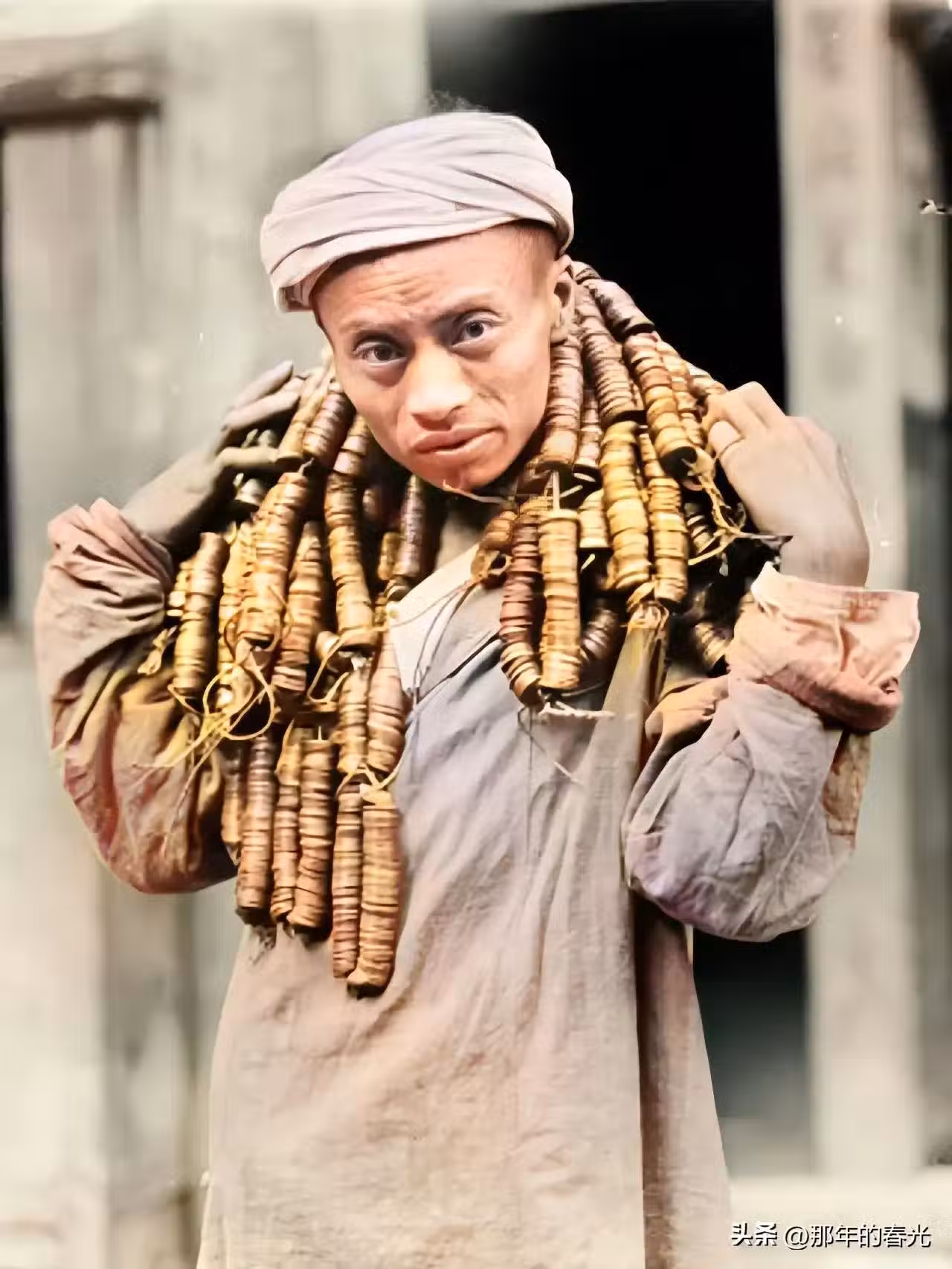 到了1917年的時候,銅錢開始快速的貶值,購買力大不如前,一名男子正扛著上萬枚的銅錢去購買商品。