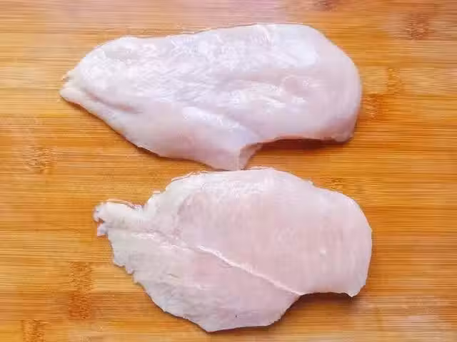2、然後用刀背在雞胸肉上輕輕敲打,將肉質稍微打散一些,這樣腌制的時候更易入味,同時也會讓雞胸肉吃起來不會很柴