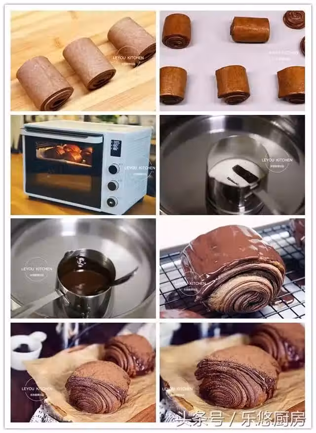 第二十二步:麵包烤好後晾涼,把巧克力醬抹在上面,如圖。