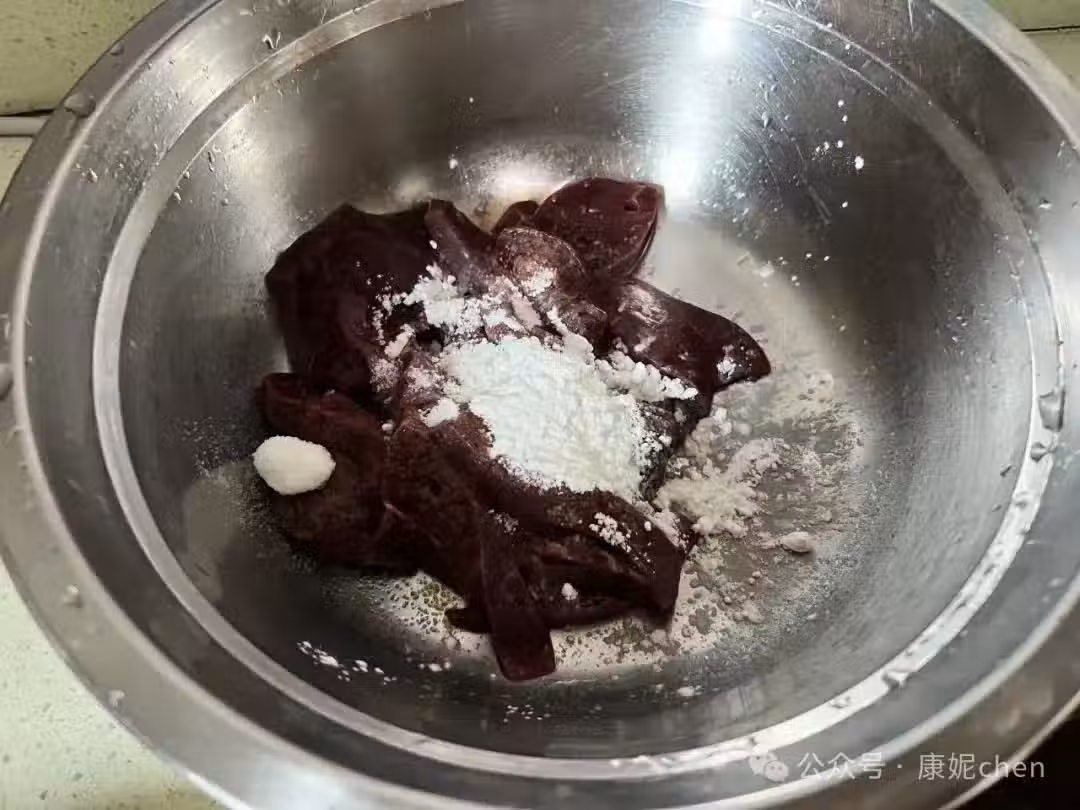 第四步:豬肝用鹽和玉米澱粉搓勻,鹽和玉米澱粉隨手放,可以多放點。
