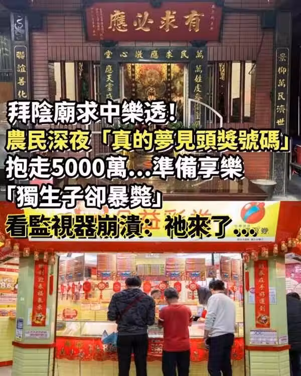 拜陰廟求中樂透!農民深夜「真的夢見頭獎號碼」抱走5000萬...準備享樂「獨生子卻暴斃」看監視器崩潰:祂來了...
