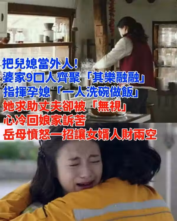 把兒媳當外人!婆家9口人齊聚「其樂融融」 指揮孕媳「一人洗碗做飯」她求助丈夫卻被「無視」心冷回娘家訴苦,岳母憤怒一招讓女婿人財兩空