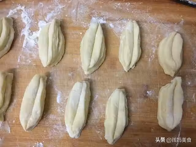 8、然後從中間切開,兩邊的角捏用手捏一下,加蓋保鮮膜醒發10-15分鐘,家裡的鍋小,這樣更好操作。