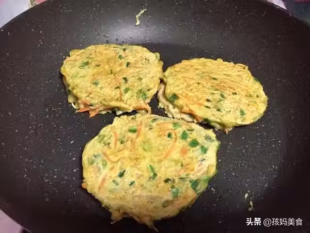 8、小火慢慢烙至底部定型翻面,直到兩面金黃即可出鍋,不能用大火,不然外麵糊了,裡面還夾生呢。