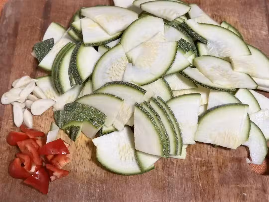 接著,將切好的小南瓜片和紅椒塊放入鍋中,與大蒜一起翻炒。隨著翻炒的進行,小南瓜逐漸變軟,紅椒的淡淡香味也慢慢滲透其中。此時,我們仔細觀察食材的變化,確保它們能夠均勻受熱。