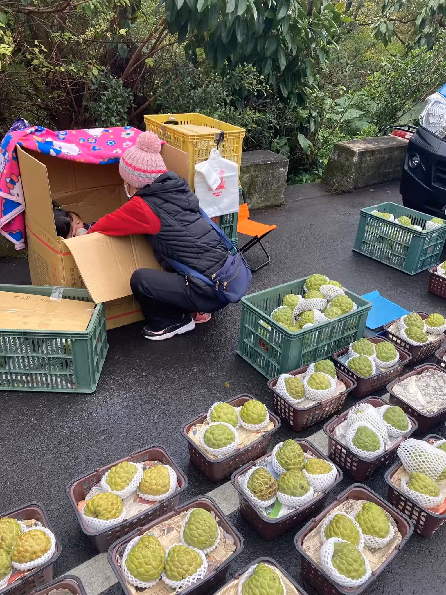 虎頭山擺攤!釋迦媽媽獨自「頂寒風冒雨撐生計」 「往紙箱塞奶瓶」掀開一看:令人鼻酸~