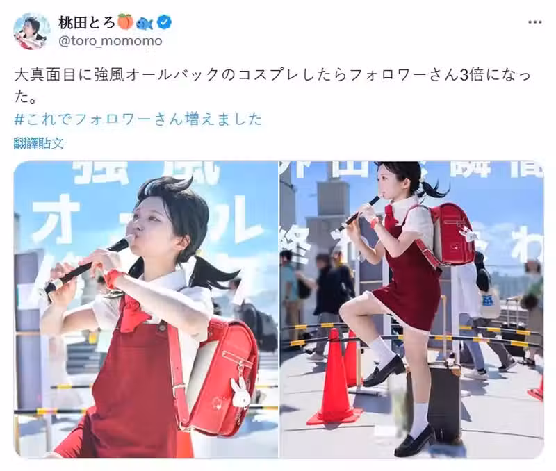 推主「桃田とろ @toro_momomo」在服裝上許多用心的搭配贏得網友的稱讚,像是那款書包(ランドセル)找來真的絕配,還有網友覺得這coser簡直可愛到一蹋糊塗,拍照時那個表情跟肢體動作,就真的很像是在逆風中前進,那股躍動感跟跳躍力隔著螢幕都能感受到