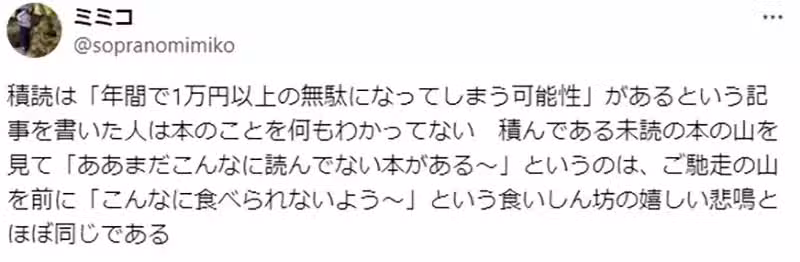「書放著不看又不會怎樣。畢竟買書買的是隨時可以看書的權利,至於行使這個權利並不是義務。實際上有時候想看才去買,很可能就會發現那本書已經絕版了,那種情況總會讓人很失望。」