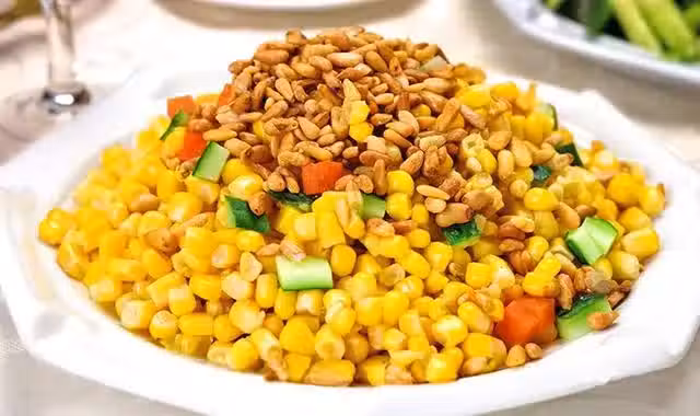 材料:糯玉米200克、青豆50克、胡蘿蔔50克、松仁30克、食鹽2克、白糖5克、胡椒粉1克、花生油30克
