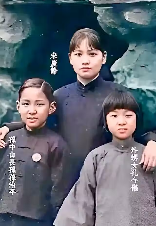 1925年,孔令儀和姨媽宋慶齡的合影!孔令儀這年10歲,站在姨媽宋慶齡的右邊,留著短髮,面帶微笑;宋慶齡這年32歲,丈夫孫中山去世不久,她悲痛不已,表情悲傷。宋慶齡的左邊的小男孩是孫中山的孫子孫治平。