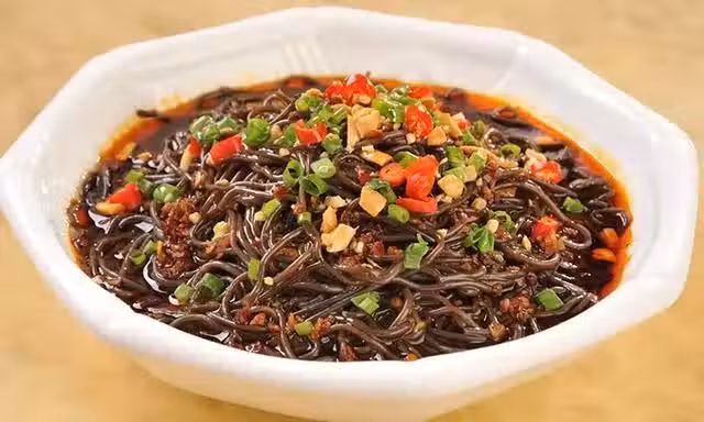 鹽半小勺,拌勻澆到蕨根粉上,撒上小蔥香菜,青紅尖椒,花生仁拌勻即可。