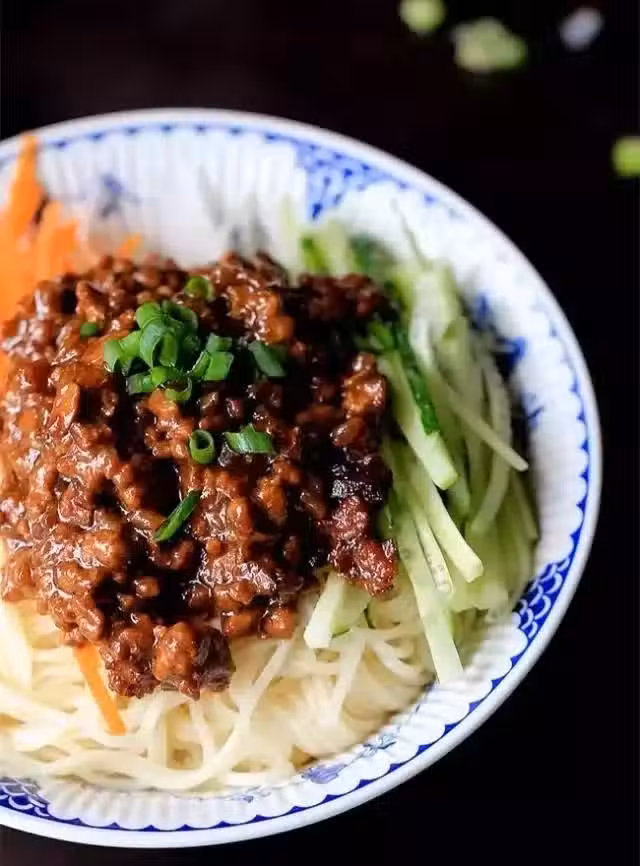 麵條、豬肉末、甜麵醬、黃豆醬、黃瓜、胡蘿蔔、蔥花、薑末、香菜