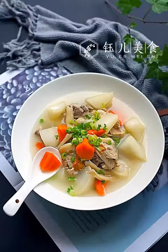 食材:排骨400克、白蘿蔔200克、胡蘿蔔半根、薑絲10克、蔥2棵、鹽2小勺、雞精少許