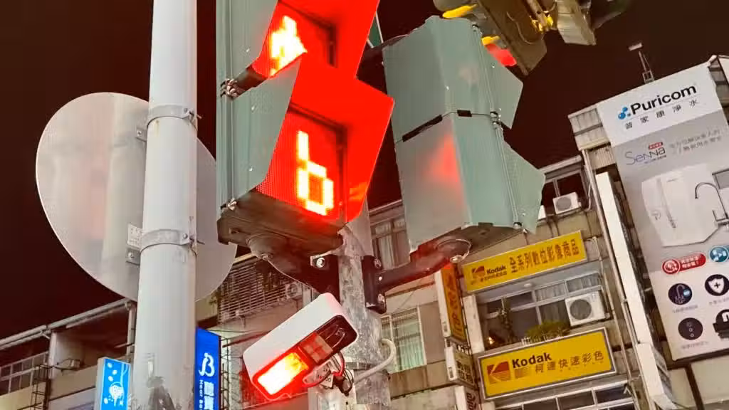 投影式紅綠燈本體裝設在交通號誌杆上,並在燈號結束前會進行閃爍。(圖片來源 / 台中市政府)