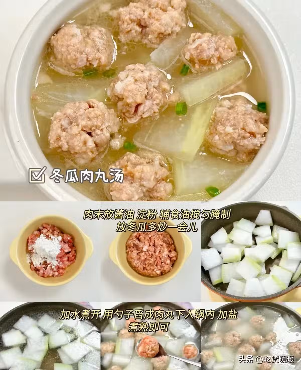 放冬瓜多炒一會兒加水煮開 用勺子舀成肉丸下入鍋內加鹽煮熟即可。