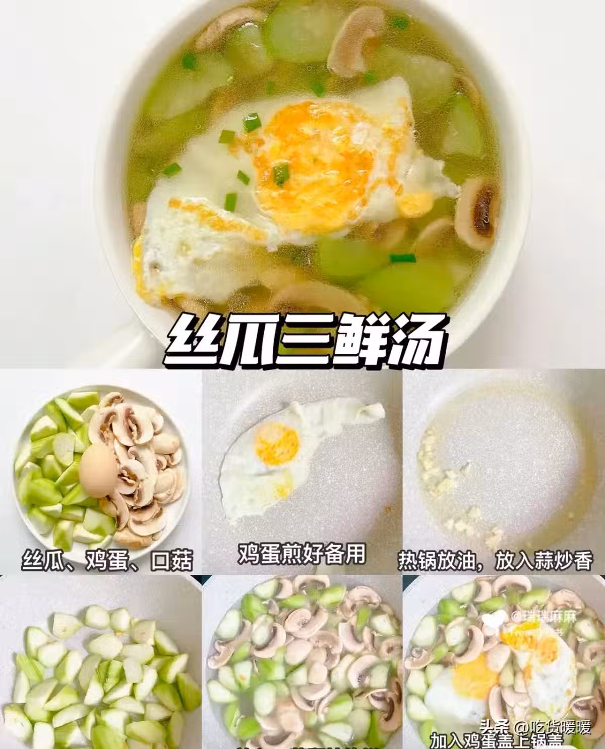 絲瓜、雞蛋、口菇 雞蛋煎好備用 熱鍋放油,放入蒜炒香 加入雞蛋蓋上鍋蓋倒入絲瓜翻炒加入適量清水煮沸放入口菇翻炒軟爛燜煮一會出鍋血紅書量鹽調味即。