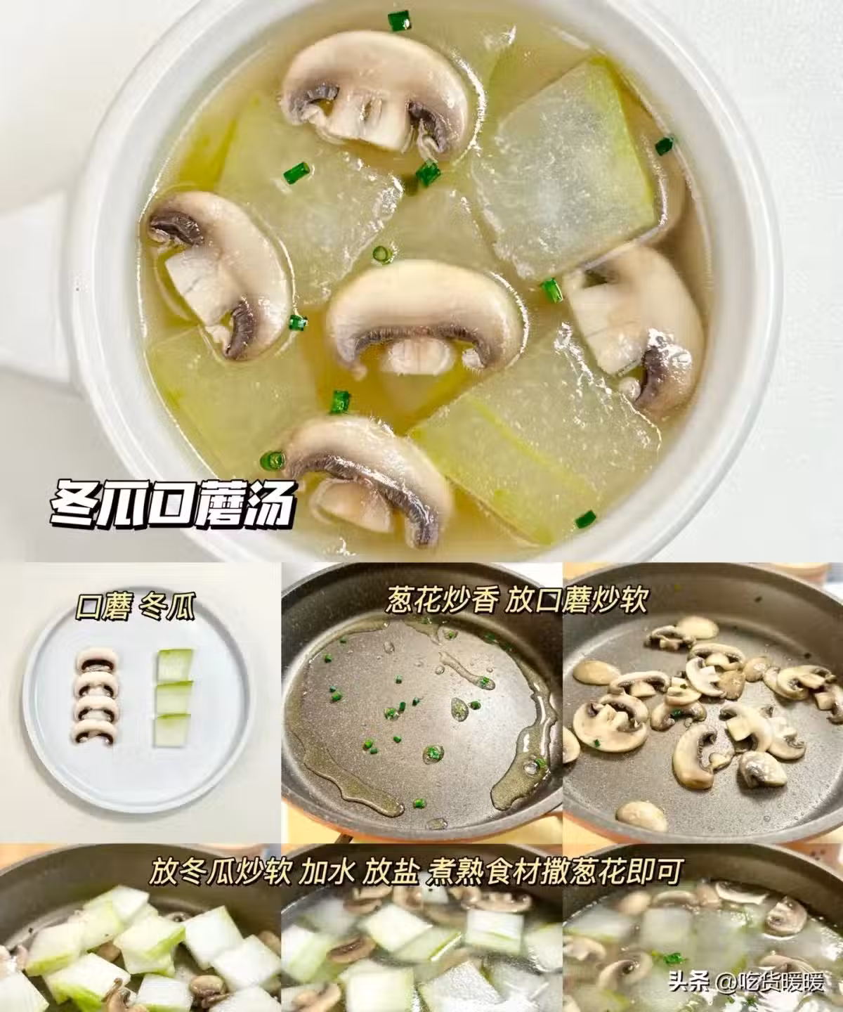 口蘑冬瓜 蔥花炒香 放口蘑炒軟放冬瓜炒軟 加水 放鹽 煮熟食材撒蔥花即可。