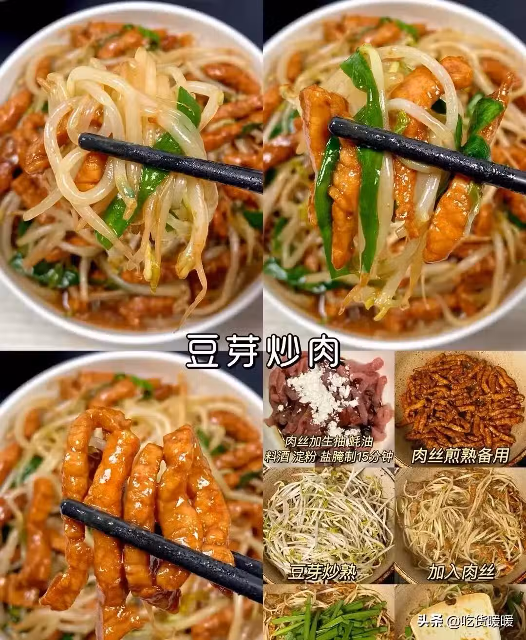 肉絲加生抽蚝油料酒澱粉 鹽腌制15分鐘 肉絲煎熟備用 豆芽炒熟 加入肉絲 抽油加1把韭菜 翻炒均勻。