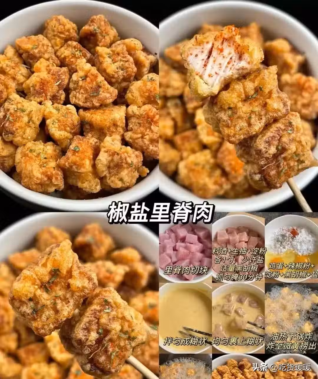 料酒+生抽+澱粉各1勺,少許鹽裡脊肉切塊 適量黑胡椒 雞蛋+辣椒粉+ 抓勻腌30分鐘澱粉+黑胡椒+鹽拌勻成糊狀 均勻裹上糊狀炸至微黃撈出油熱下鍋炸復炸至金黃色歐芹碎辣椒粉,牛約帶與椒黃62即對開吃。