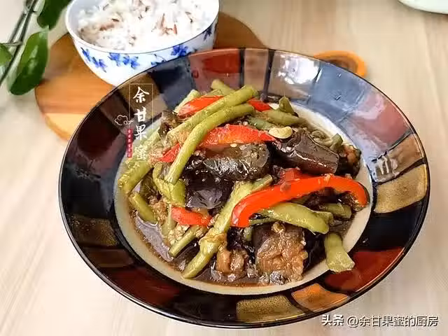 做法:將豆角入鍋炒一炒至變色,加入黃豆醬炒勻,燉五分鐘後加入茄子,加入醬油和精鹽,炒勻,再燉五六分鐘至茄子軟爛,加入辣椒和蒜片炒勻出鍋。