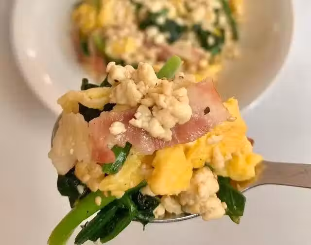 豆腐代替米飯。放入新鮮的菠菜、培根和雞蛋炒的炒飯。用蚝油調味, 用菠菜和雞蛋補充營養, 是一碗飽滿的一道料理。