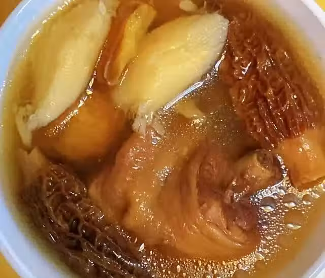 3、羊肚菌洗凈浸泡15分鐘,浸泡的水不要倒了‼️加入湯鍋煲