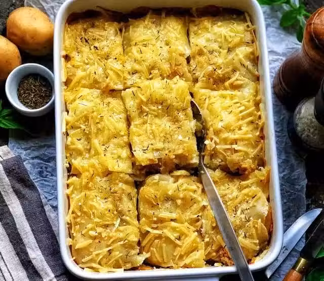 食材:土豆1000克、純素肉餡250克、純素芝士碎適量、鹽適量、現磨黑胡椒適量、橄欖油適量、無糖植物奶 2/3杯(約170毫升)、干百里香少許(可省)