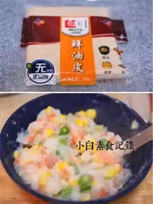 2 取一張油皮,中間放上土豆泥,如圖包好,如果末端不好黏合可以直接抹一點土豆泥幫助黏合。