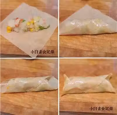 3.鍋燒熱下少許油,放入油皮卷小火煎至表面金黃即可。吃的時候可根據口味沾適量醬油醋