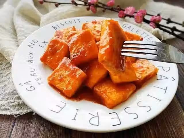 老豆腐250克,番茄沙司30克,黑醋2小勺,白糖1小勺,澱粉1小勺,清水3-4小勺,白芝麻適量