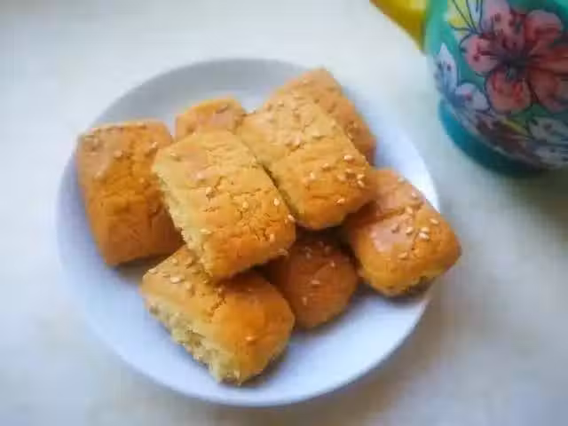 原料:麵粉500克(低筋麵粉),糖150克,豆油200克,泡打粉3克,臭粉3克,芝麻50克