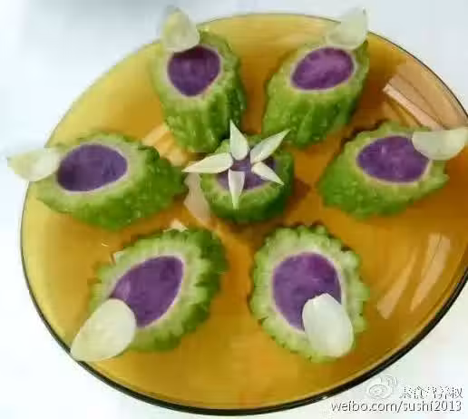 5、將紫薯瓤放入苦瓜芯中,放上百合,擺好盤兒即可。