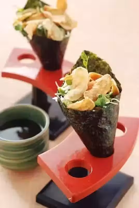 3、取一片海苔置於手心,依序放上綜合蔬菜、作法2的炸牛蒡,再撒上熟白芝麻、擠入醬料,順勢垂直包裹捲起呈倒三角錐狀,即為牛蒡手卷。