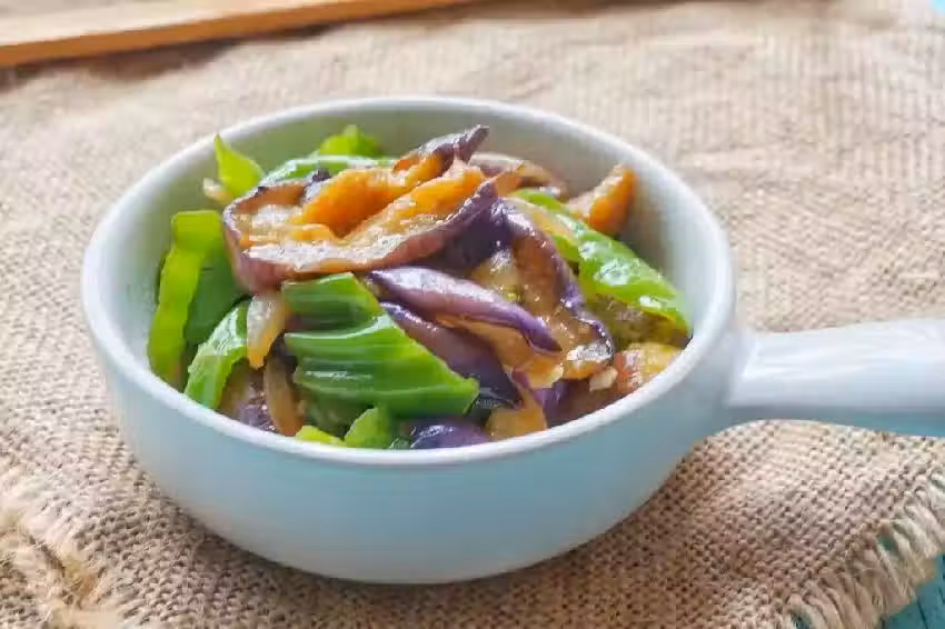 茄子2個,青椒4個,鹽3茶匙,植物油1湯匙,蔬果調味粉適量