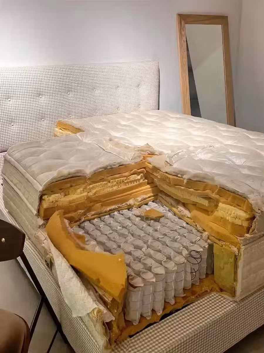 雲南有一名男子在網上買了一張床墊,夫妻倆睡在床墊上,覺得床墊很硬,質量很差,就用刀切開床墊,當夫妻二人用刀切開床墊後,他們震驚地發現,裡面的填充物雜亂不堪。原本應該是柔軟舒適的材質,卻充斥著大量的碎布條、黑心棉、裸露的彈簧,甚至還有一些不明的硬塊。這些劣質的材料散發著一股刺鼻的氣味,讓他們忍不住皺眉。